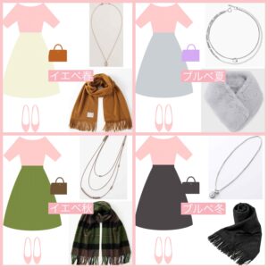 逆に淡いトーンが苦手なタイプは、色がしっかりあるものやマットゴールドのアクセサリーなどを合わせて下さい。